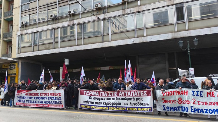 Με μεγάλη συμμετοχή πραγματοποιήθηκε το πρωί της Τετάρτης η απεργιακή κινητοποίηση των εργαζομένων στον Επισιτισμό, τον Τουρισμό και τα ξενοδοχεία της Αττικής, στο πλαίσιο της 24ωρης απεργίας του κλάδου.