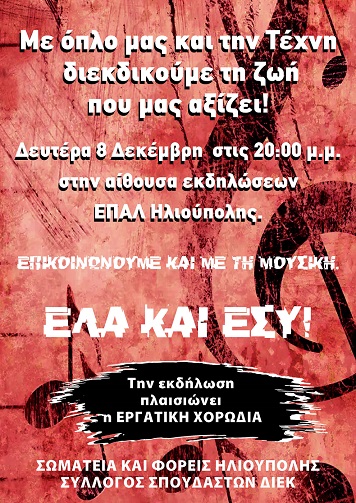 Η εκδήλωση θα πραγματοποιηθεί τη Δευτέρα 8 Δεκέμβρη, στις 8.00μμ, στην αίθουσα του 1ου ΕΠΑΛ και ΣΑΕΚ Ηλιούπολης (Εθνάρχου Μακαρίου 4 και Πάροδος Βουλιαγμένης 523).