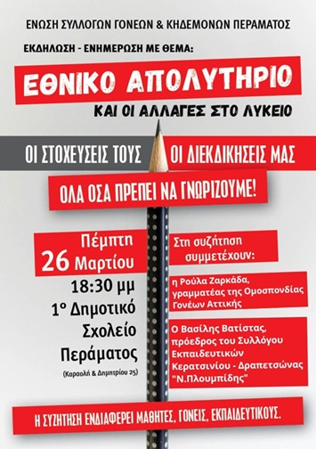 ΕΛΜΕ Πειραιά: Ενδιαφέρουσα εκδήλωση της Ένωσης Συλλόγων Γονέων και Κηδεμόνων Περάματος για το Εθνικό Απολυτήριο