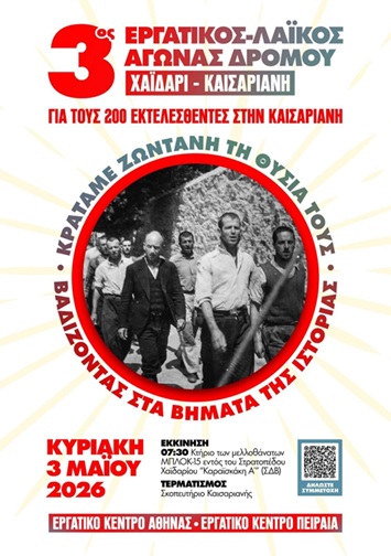 Για τρίτη συνεχόμενη χρονιά η Ένωση Λογιστών Ελεγκτών Περιφέρειας Αττικής, συμμετέχει στον εργατικό – λαϊκό αγώνα δρόμου που θα διεξαχθεί την Κυριακή 3 Μάη, στο πλαίσιο των εκδηλώσεων της Εργατικής Πρωτομαγιάς, τιμώντας τους 200 κομμουνιστές που εκτελέστηκαν στην Καισαριανή από τους ναζί που διοργανώνουν τα Εργατικά Κέντρα Αθήνας και Πειραιά