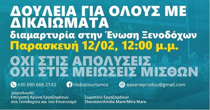 Την Παρασκευή 12 Φεβρουαρίου στις 12 το μεσημέρι, οργανώνουμε διαμαρτυρία έξω από την Ένωση Ξενοδόχων Ρόδου.