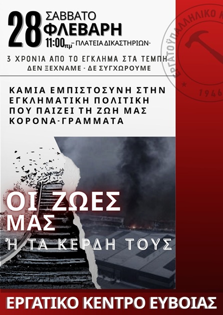 Στις 28 Φλεβάρη συμπληρώνονται 3 χρόνια από το προδιαγεγραμμένο έγκλημα στα Τέμπη, που στοίχισε τη ζωή σε 57 συνανθρώπους μας και συγκλόνισε ολόκληρο τον λαό. Λίγες μέρες μετά, στις 23 Μάρτη, ξεκινά η κύρια δίκη.
