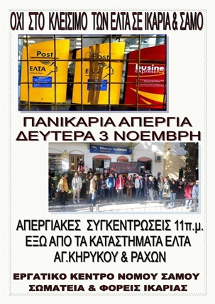 Καλούμε τους κατοίκους και τους φορείς των νησιών Σάμου και Ικαρίας σε γενικό ξεσηκωμό και συμμετοχή στην Απεργία και τις απεργιακές συγκεντρώσεις τη Δευτέρα 3 Νοέμβρη ενάντια στην περαιτέρω υποβάθμιση της ποιότητας της ζωής μας διεκδικώντας: