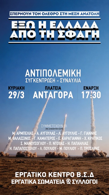 Εργατικό Κέντρο – Σωματεία- Σύλλογοι ΒΣ Δωδεκανήσου: Αφίσα για την Αντιπολεμική συναυλία 29 Μαρτίου Δημοσιεύτηκε στις 27 Μαρτίου 2026 FacebookXWhatsAppEmailΤυπώνωViberCopy URL Περισσότερα Αφίσες Αφίσα για το Συλλαλητήριο 27 Μάρτη – 6.30μμ στο υπ.Οικονομικών στο Σύνταγμα 23 Μαρτίου 2026 Αφίσες Φοιτητικοί Σύλλογοι Αθήνας: Έξω η Ελλάδα από τον πόλεμο, Να φύγουν οι βάσεις του θανάτου 16 Μαρτίου 2026 Αφίσες Μετώπου Αγώνα Σπουδαστών: Αφίσα για την Πανελλαδική Αντιπολεμική μέρα δράσης των Φοιτητικών Συλλόγων στις 17 Μάρτη 11 Μαρτίου 2026