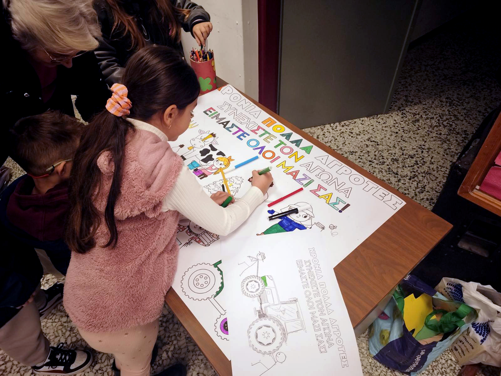 Παράλληλα για τις πιο μικρές ηλικίες των μικρών μας φίλων ήταν σε εξέλιξη παράλληλη δραστηριότητα όπου τα παιδιά ζωγράφιζαν εορταστικά μηνύματα για τους αγωνιστές εργάτες καθώς και για τους βιοπαλαιστές αγροτοκτηνοτρόφους που βρίσκονται στα μπλόκα.  Σε μια περίοδο που ο λαός μας δοκιμάζεται από την ακρίβεια και την εργασιακή ανασφάλεια η γιορτή αυτή αποτέλεσε μια ανάσα με ένα  ξεκάθαρο μήνυμα αλληλεγγύης.