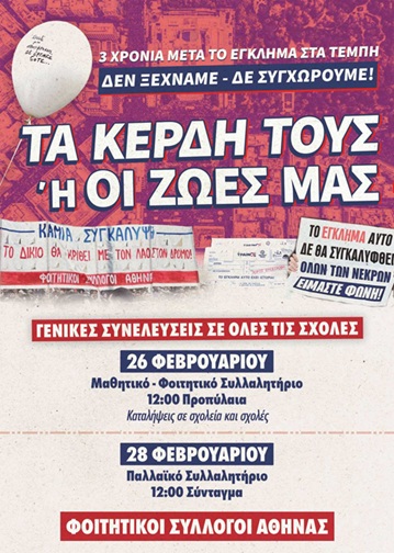Συμμετέχουμε στο μεγάλο, παλλαϊκό συλλαλητήριο που διοργανώνουν τα εργατικά σωματεία, το Σάββατο 28 Φλεβάρη στις 12:00 στο Σύνταγμα, τη μέρα που συμπληρώνονται 3 χρόνια από το έγκλημα!