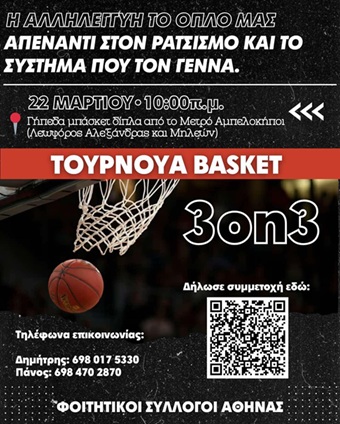 Οι Φοιτητικοί Σύλλογοι Αθήνας διοργανώνουν τουρνουά Basket 3on3 μαζί με την Κυριακή 22 Μαρτίου στις 11:00 στα γήπεδα μπάσκετ δίπλα στο μετρό Αμπελόκηποι(Λεωφόρος Αλεξάνδρας και Μηλέωνμε αφορμή την Παγκόσμια Ημέρα κατά του Ρατσισμού στις 21 Μαρτίου. Στα πλαίσια του τουρνουά θα πραγματοποιηθεί βράβευση των τριών πρώτων ομάδων και η συμμετοχή είναι δωρεάν.