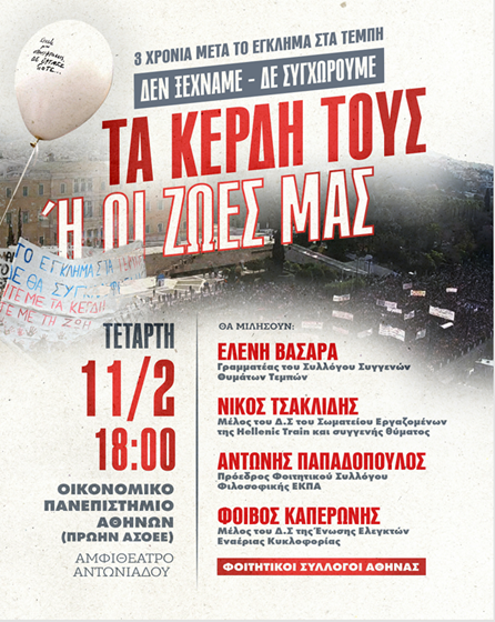 3 χρόνια μετά, η νέα γενιά δε συγχωρεί! Δεν μπορούμε να αποδεχτούμε ως φυσιολογικό, ως κανονικότητα στον 21ο αιώνα, δύο τρένα να κινούνται αντίθετα στις ίδιες ράγες. Δε δεχόμαστε η ίδια μας η ζωή, η ασφάλεια μας, η υγεία μας, να γίνεται θυσία στον βωμό των κερδών! Δεν ανεχόμαστε την προσπάθεια συγκάλυψης των αιτιών και των πραγματικών υπευθύνων.