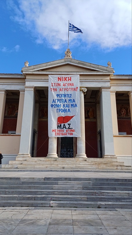 Ο αγώνας των αγροτών είναι δίκαιος, είναι αγώνας όλων μας και θα τον στηρίξουμε μέχρι τέλους! Η ανυποχώρητη και αγωνιστική στάση των αγροτών στα μπλόκα αποτελεί παράδειγμα! Ο αγώνας τους αφορά όλο τον λαό και την νεολαία, καθώς βιώνουμε τις πανάκριβες τιμές των αγροτικών προϊόντων στα ράφια των supermarket, ενώ οι αγρότες πωλούν τα προϊόντα τους στους εμποροβιομήχανους σε εξευτελιστικές τιμές. Για χιλιάδες φοιτητές και φοιτήτριες που προέρχονται από αγροτικές οικογένειες αυτός ο αγώνας είναι κυριολεκτικά αγώνας επιβίωσης.