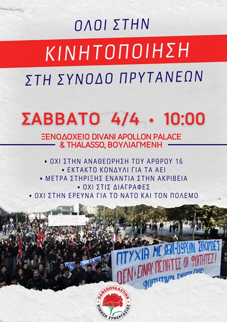 Όλοι στη συγκέντρωση των Φοιτητικών Συλλόγων στη Σύνοδο Πρυτάνεων, το Σάββατο 4/4 στις 10:00 έξω από το ξενοδοχείο Divani Apollon Palace & Thalasso στη Βουλιαγμένη.