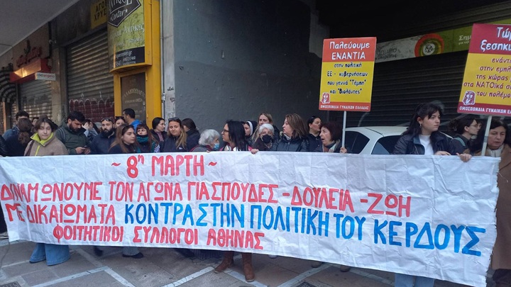 Η Ομοσπονδία Γυναικών Ελλάδας, μαζί με τα σωματεία και φοιτητικούς συλλόγους, προχώρησαν χθες σε κινητοποίηση στο Υπ. Εργασίας τιμώντας την 8η Μάρτη και απαιτώντας από την κυβέρνηση προστασία της εργαζόμενης γυναίκας και μέτρα υγείας και ασφάλειας στους χώρους δουλειάς ενάντια στην εντατικοποίηση.