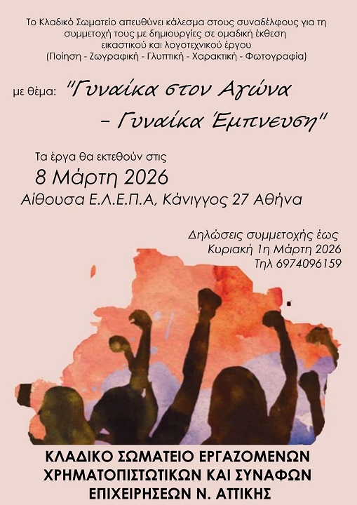 Το Κλαδικό Σωματείο απευθύνει κάλεσμα στους συναδέλφους για τη συμμετοχή τους με δημιουργίες σε ομαδική έκθεση εικαστικού και λογοτεχνικού έργου (Ποίηση – Ζωγραφική – Γλυπτική – Χαρακτική – Φωτογραφία) με θέμα :