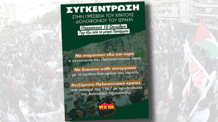 Όλοι και όλες στο συλλαλητήριο, την Παρασκευή 10 Οκτώβρη στις 7 μ.μ., στο σταθμό του Μετρό “Πανόρμου” και στην πορεία στην πρεσβεία του Ισραήλ