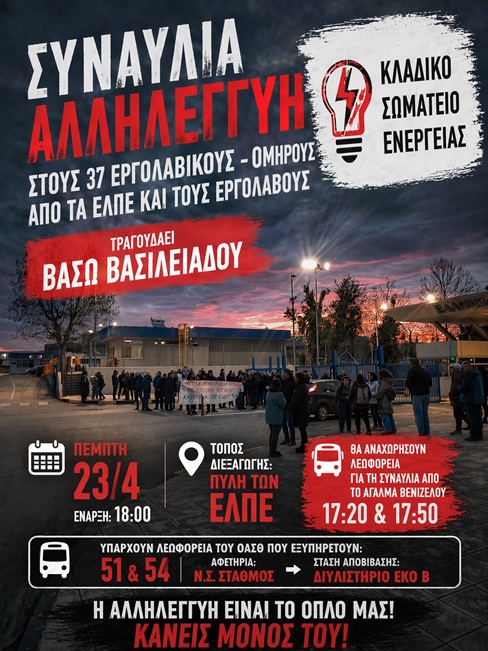 Μετά από δεκάδες κινητοποιήσεις σε Θεσσαλονίκη και Αθήνα και μετά από 8 απεργιακές μάχες το Κλαδικό Σωματείο Ενέργειας οργανώνει μεγάλη Συναυλία αλληλεγγύης την Πέμπτη 23/4 στις 18:00, στην πύλη των ΕΛΠΕ, για τη στήριξη των 37 εργολαβικών εργαζομένων που βρίσκονται σε ομηρία από τα ΕΛΠΕ και τους Εργολάβους.