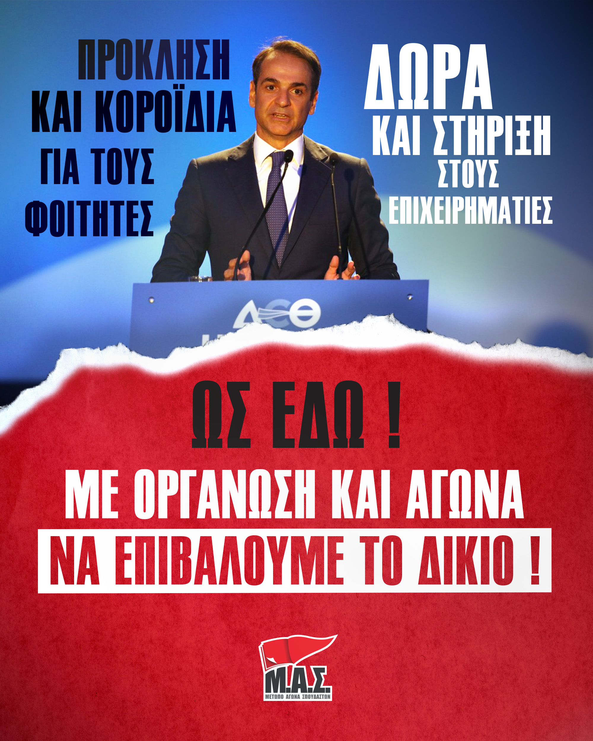 Την στιγμή που ετοιμάζεται να νομοθετήσει τη σκλαβιά των 13 ωρών δουλειάς, που έχει ματώσει τις οικογένειες μας με τους άδικους φόρους και που δίνει δισεκατομμύρια για τους πολέμους και τις επιχειρηματικές μπίζνες κουνάει το δάκτυλο στους φοιτητές και δεν λέει κουβέντα για τις δίκαιες διεκδικήσεις μας!