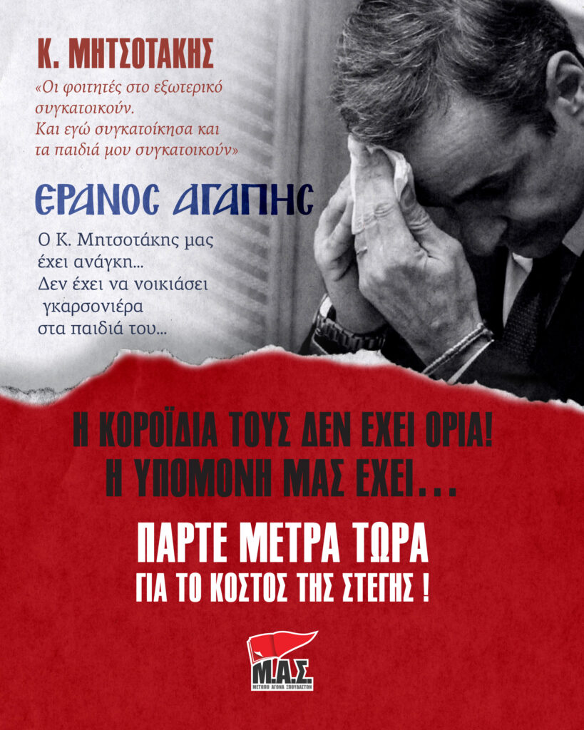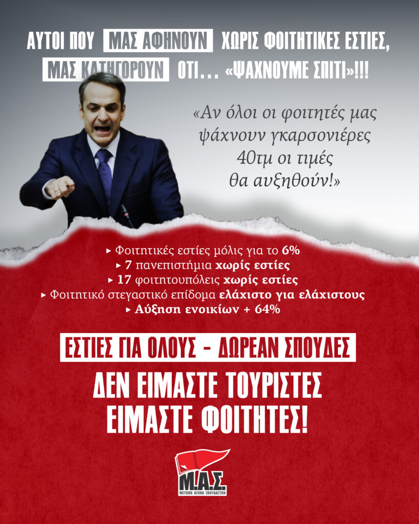 Αυτοί που μας άφησαν χωρίς φοιτητικές εστίες, μας κατηγορούν για το ότι ψάχνουμε σπίτι και «ανεβάζουμε τις τιμές» της αγοράς ακινήτων που η κυβέρνηση υπηρετεί κάνοντας όλα τα χατίρια σε real estate και εταιρίες που φτιάχνουν ιδιωτικές εστίες με πανάκριβα ενοίκια εκμεταλλευόμενοι την έλλειψη.