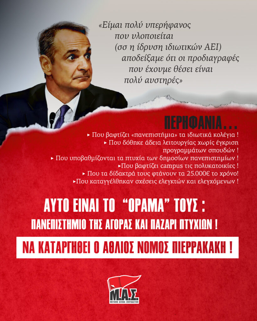 «Είμαι πολύ υπερήφανος που υλοποιείται (…) αποδείξαμε ότι οι προδιαγραφές που έχουμε θέσει είναι πολύ αυστηρές». Για ποιο πράγμα δηλώνει περήφανος; Που βαφτίζει «πανεπιστήμια» τα ιδιωτικά κολέγια, που δόθηκε άδεια λειτουργίας χωρίς έγκριση προγραμμάτων σπουδών, που υποβαθμίζονται τα πτυχία των δημοσίων πανεπιστημίων, που βαφτίζει campus τις πολυκατοικίες, που τα δίδακτρά τους φτάνουν τα 25.000€ το χρόνο, που καταγγέλθηκαν σχέσεις ελεγκτών και ελεγχόμενων;
