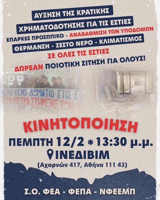 Η ώρα της σημερινής προγραμματισμένης κινητοποίησης των Σ.Ο. ΦΕΑ ΦΕΠΑ ΝΦΕΕΜΠ μεταφέρεται στις 13.30 ώστε να πραγματοποιηθεί ταυτόχρονα με την συνάντηση αντιπροσωπείας από τους Σ.Ο. με την διοίκηση του ΙΝΕΔΙΒΙΜ.
