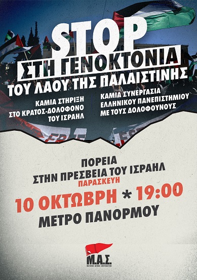 Παρασκευή 10 Οκτώβρη πορεία στην Ισραηλινή Πρεσβεία, στις 19:00 σταθμό μετρό της Πανόρμου