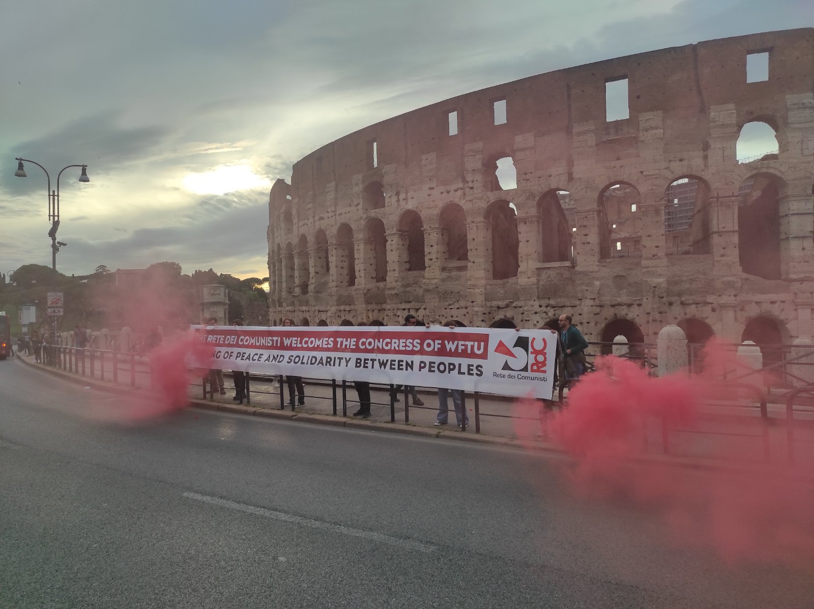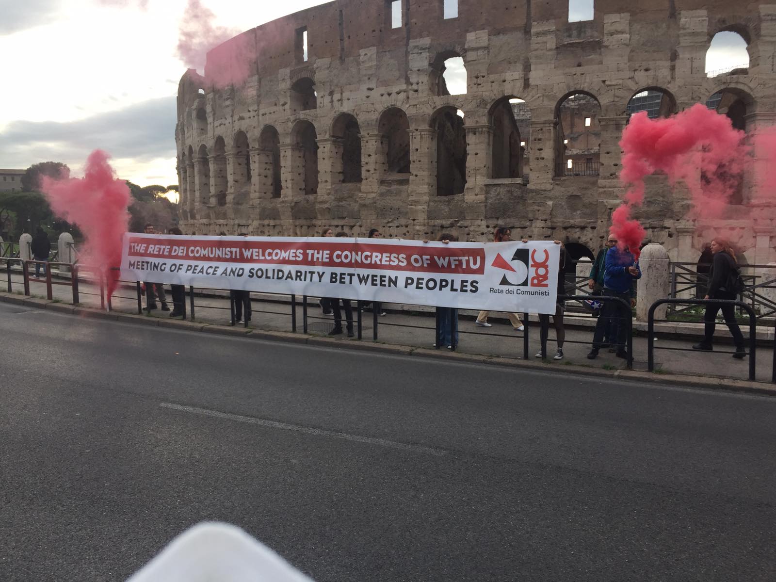 Σε μια πολύ όμορφη κίνηση αγωνιστές της USB και νεολαίοι κομμουνιστές της Ρώμης υποδέχτηκαν τους αντιπροσώπους του συνεδρίου της ΠΣΟ στο κέντρο της Ρώμης με καπνογόνα μπροστά στο Κολοσσαίο και πανό που έγραφε