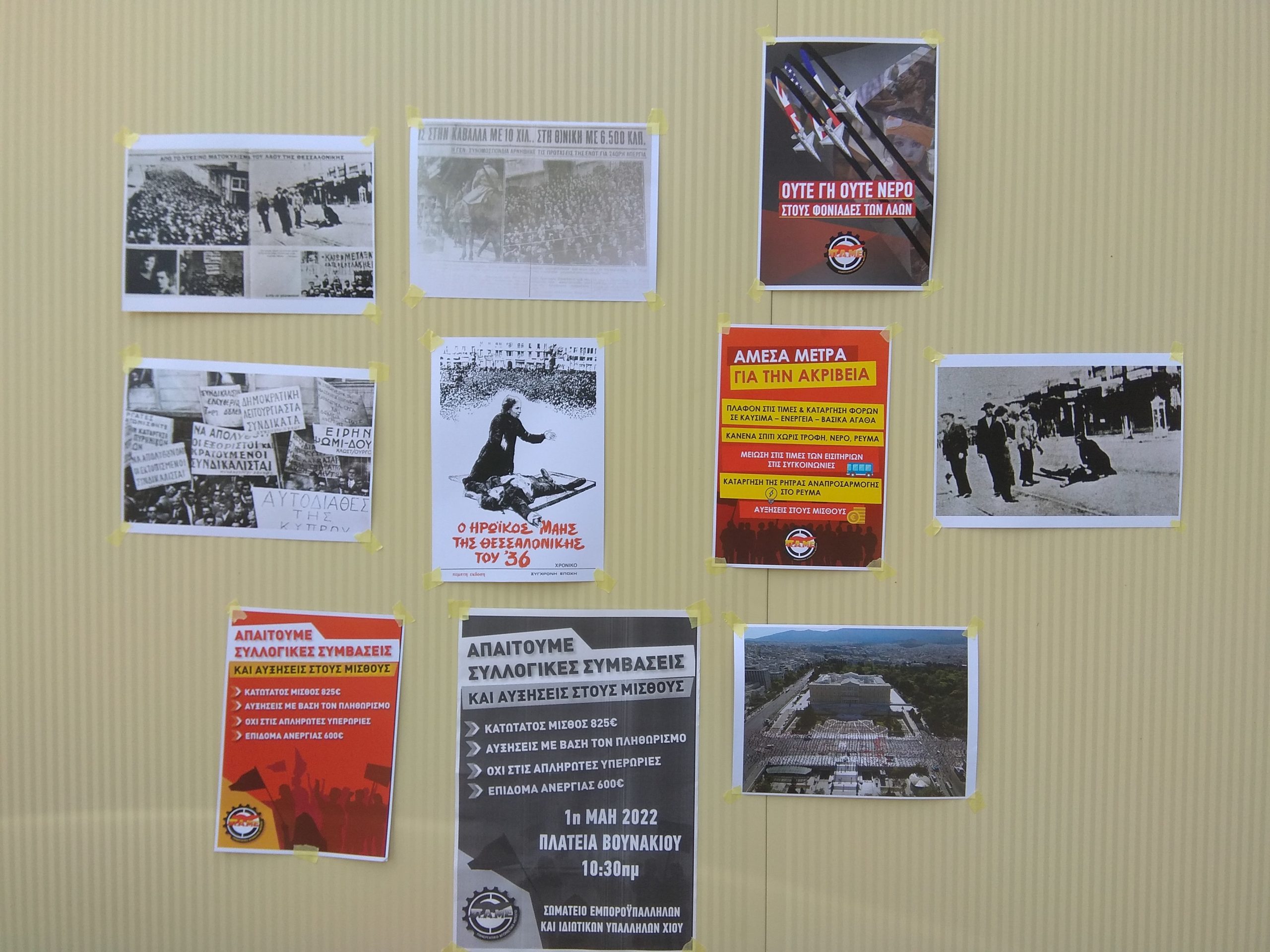 Μια πρωτότυπη πρωτοβουλία του Σωματείου Εμποροϋπαλλήλων και Ιδιωτικών Υπαλλήλων Χίου πραγματοποιήθηκε την Παρασκευή 29 Απρίλη 2022 μπροστά στην απεργία της Πρωτομαγιάς. Μέλη του ΔΣ του Σωματείου έφτιαξαν κολάζ φωτογραφιών από εμβληματικές Πρωτομαγιάτικες απεργίες στην Ελλάδα. Ήταν ιδιαίτερο το ενδιαφέρον των συναδέλφων για το πως οι εργαζόμενοι έδιναν την μάχη κάτω από πολύ δύσκολες συνθήκες, όπου απέναντι τους δεν είχαν μόνο την εργοδοτική τρομοκρατία αλλά και τα όπλα του κράτους.