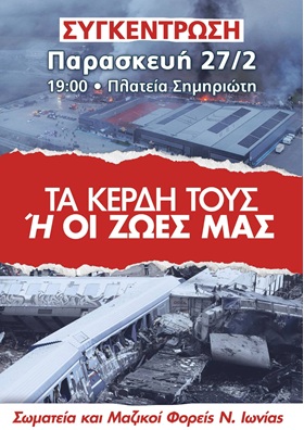 • Είναι εδώ οι αιτίες και οι υπεύθυνοι. Για να υπερασπιστούμε τη ζωή τη δική μας και των παιδιών μας απαιτείται σύγκρουση που να στρέφεται απέναντι στον πραγματικό ένοχο, την εγκληματική πολιτική του κέρδους και όσους την υπηρετούν. Η πραγματική δικαίωση για το έγκλημα στα Τέμπη, για τους νεκρούς στους χώρους δουλειάς, για τα παιδιά μας, θα έρθει μέσα από τον συλλογικό και οργανωμένο αγώνα για να ανατραπεί η πολιτική και το σύστημα που γεννά καθημερινά νέα εγκλήματα