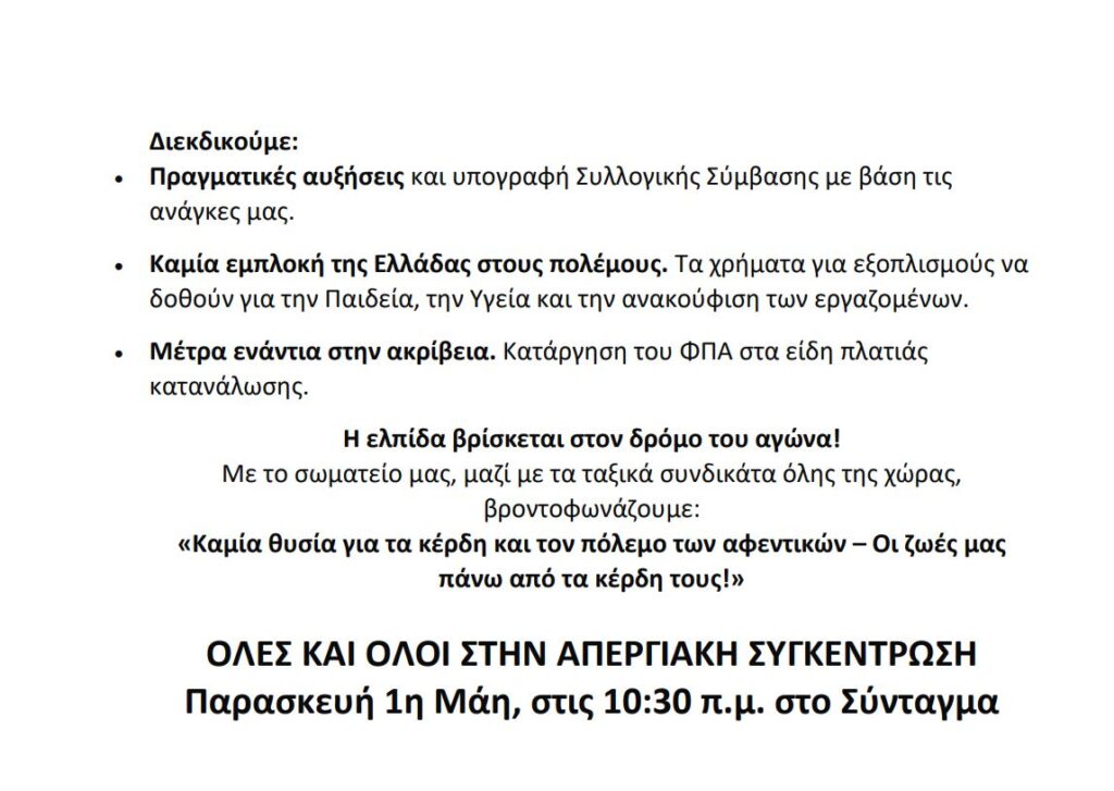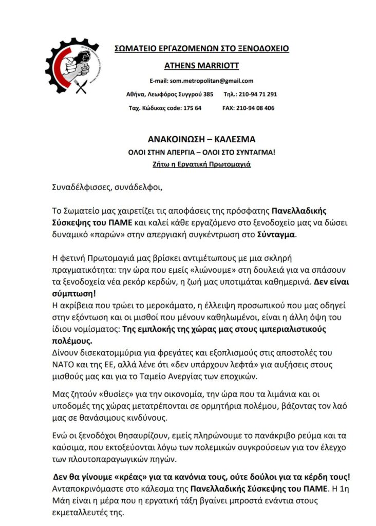 Σωματείο Εργαζομένων στο Ξενοδοχείο Athens Marriott – Όλοι στην απεργιακή συγκέντρωση της Πρωτομαγιάς στις 10.30 στο Σύνταγμα Δημοσιεύτηκε στις 8 Απριλίου 2026 FacebookXWhatsAppEmailΤυπώνωViberCopy URL Περισσότερα Φορείς & Σωματεία Κοινή ανακοίνωση Συνδικάτου Μετάλλου Αττικής και Σωματείο Εργαζομένων στην Ενέργειας – Όλοι στην στάστη εργασίας στις 8/4 σε όλες τις εργολαβικές εργασίες του... ΟΛΟΙ ΣΤΗ ΣΤΑΣΗ ΕΡΓΑΣΙΑΣ 07:00πμ-09:00πμ ΤΗΝ ΤΕΤΑΡΤΗ 8 ΑΠΡΙΛΗ ΣΕ ΟΛΕΣ ΤΙΣ ΕΡΓΟΛΑΒΙΚΕΣ ΕΡΓΑΣΙΕΣ του shutdown στα... 8 Απριλίου 2026 Φορείς & Σωματεία ΣΕΤΗΠ: Πρωτομαγιά 2026 από τους αγώνες του χθες, στις μάχες του σήμερα — συνεχίζουμε! Όλοι στην απεργιακή συγκέντρωση 10.30πμ στο Σύνταγμα 1η ΜΑΗ 1886 ΣΙΚΑΓΟ – 1936 ΘΕΣΣΑΛΟΝΙΚΗ – 1944 ΚΑΙΣΑΡΙΑΝΗ ΑΠΕΡΓΙΑ ΠΡΩΤΟΜΑΓΙΑ 2026, ΣΥΝΤΑΓΜΑ 10:30 Από... 8 Απριλίου 2026 Φορείς & Σωματεία Σωματείο Συνταξιούχων ΙΚΑ Ηλιούπολης – Αλληλεγγύη στο λαό της Κούβας ΑΛΛΗΛΕΓΓΥΗ ΣΤΟ ΛΑΟ ΤΗΣ ΚΟΥΒΑΣ Το Δ.Σ. του Σωματείου μας ομόφωνα αποφάσισε ότι άμεσα πρέπει... 8 Απριλίου 2026
