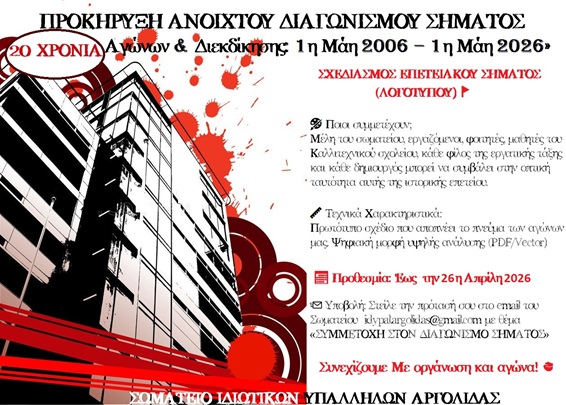 Σας καλούμε να βάλετε τη δική σας δημιουργική σφραγίδα στην επέτειο του Σωματείου μας. 20 χρόνια μετά, συνεχίζουμε πιο έμπειροι, πιο μαζικοί, πιο αποφασιστικοί για τους νικηφόρους εργατικούς αγώνες του μέλλοντος.