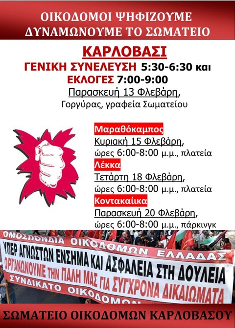 Σωματείο Οικοδόμων Καρλοβάσου: Γενική συνέλευση και εκλογές Οικοδόμων Καρλοβάσου