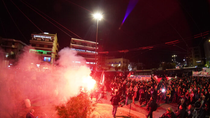 Οι διαδηλωτές συγκεντρώθηκαν στη στάση μετρό «Πανόρμου» και πορεύτηκαν στην πρεσβεία του κράτους – δολοφόνου Ισραήλ.
