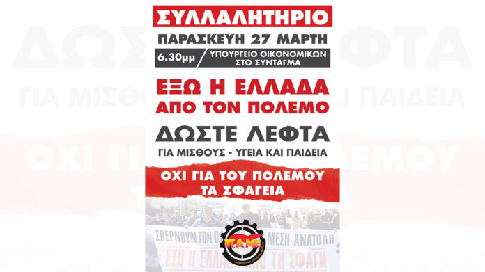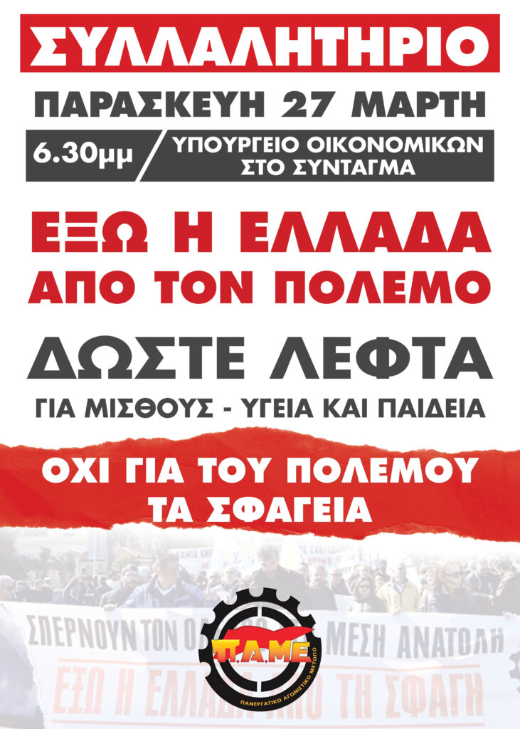 Πανελλαδική Σύσκεψη ΠΑΜΕ στις 4 Απρίλη στην Καισαριανή – Καμία θυσία για τον πόλεμο και τα κέρδη τους, οργάνωση και αγώνας για την ανατροπή