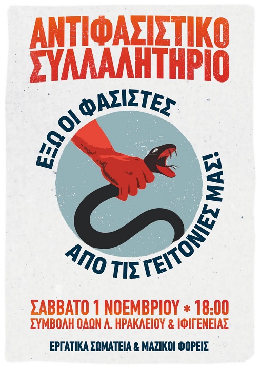 Σας καλούμε σε αντιφασιστική  συγκέντρωση το Σάββατο 1 Νοεμβρίου στις  6  μ.μ. στη συμβολή των οδών Λ. Ηρακλείου και Ιφιγενείας για να καταδικάσουμε τα φασιστικά μορφώματα και το εκμεταλλευτικό σύστημα που τα γεννά και τα θρέφει.