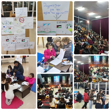 Πριν την έναρξη της παράστασης τα παιδιά ζωγράφισαν για την ειρήνη, για την αλληλεγγύη σε όλα τα παιδιά της γης και τους λαούς που αγωνίζονται ενάντια στους πολέμους, για να ζήσουν ελεύθεροι ,όπως στην Παλαιστίνη, στην Ουκρανία κ.α . Πολλά παιδιά ζωγράφισαν επίσης και για τον αγώνα των αγροτών, που εδώ και ένα μήνα μένουν ακλόνητοι στα μπλόκα ,δίνοντας ακόμα ένα στήριγμα για να αντέξουν και να συνεχίσουν τις διεκδικήσεις τους.