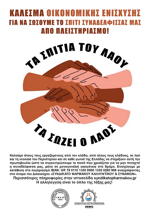 ΕΝΙΣΧΥΟΥΜΕ ΤΗΝ ΠΡΩΤΟΒΟΥΛΙΑ ΤΟΥ ΣΥΝΔΙΚΑΤΟΥ ΜΑΣ ΚΑΙ ΤΟΥ ΣΩΜΑΤΕΙΟΥ ΕΡΓΑΖΟΜΕΝΩΝ DEMO ΚΑΙ ΣΥΓΚΕΝΤΡΩΝΟΥΜΕ ΑΜΕΣΑ ΧΡΗΜΑΤΑ ΓΙΑ ΝΑ ΣΩΣΟΥΜΕ ΤΟ ΣΠΙΤΙ ΤΗΣ ΣΥΝΑΔΕΛΦΙΣΣΑΣ ΜΑΣ