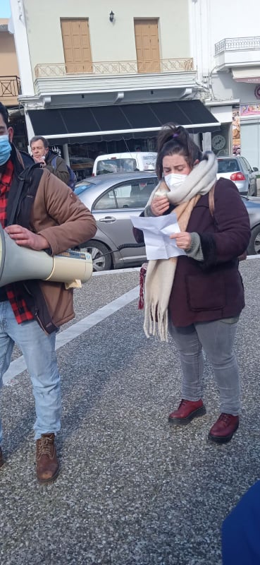 Απευθυνόμενοι στους μαθητές και εκπαιδευτικούς, η εκπρόσωπος του ΕΚΣ, τόνισε: «Στεκόμαστε στο πλευρό σας και πώς αλλιώς αφού εμείς οι ίδιοι οι εργαζόμενοι, οι γονείς σας και συνάδελφοί  σας,  μαζί με εσάς έχουμε βιώσει τα τελευταία δύο χρόνια τις επιπτώσεις της πανδημίας και της πολιτικής που υπηρετούν ΝΔ, ΣΥΡΙΖΑ, ΠΑΣΟΚ/ΚΙΝΑΛ, που αφενός επιβάλλει στους εργαζόμενους πρωτόκολλα βαρβαρότητας (τηλεργασία, απολύσεις, αναστολές, πρόγραμμα ΣΥΝ-Εργασία, μείωση μισθού αν νοσήσει το παιδί μας) αφετέρου συνεχίζει να μην παίρνει μέτρα για την αραίωση των μαθητών στις τάξεις, να μην ενισχύει το προσωπικό καθαριότητας, να μην κάνει προσλήψεις εκπαιδευτικών. Χρεώνει τα πάντα στην «ατομική ευθύνη» για να αποφύγει τις δικές της και προβάλλει σαν πανάκεια τη λύση της τηλεκπαίδευσης, που είναι η πιο νοσηρή μέθοδος για την ψυχική υγεία των παιδιών και ακριβή λύση για γονείς και μαθητές».